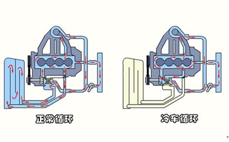 再来说说防冻液的循环,分为大循环和小循环,是通过节温器进行转换的,发动机在冷车启动的时候,此时防冻液温度较低,达不到发动机正常工作的温度,此时节温器处于关闭状态,在水泵的作用下防冻液只在发动机内部循环,不经过水箱散热器,待防冻液温度慢慢升高后,达到节温器的临界值,节温器会慢慢打开,逐渐转换为大循环,也就是防冻液动过发动机水道带走热量后返回水箱的上部,经散热后由水箱下部管道进入发动机,如此循环,带走发动机的热量。