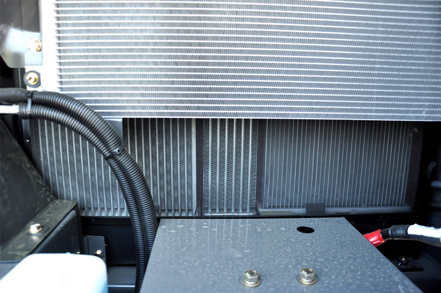 包括水箱散热器、液压油散热器、空调散热器、中冷散热器,清楚散热器内部灰尘杂物,将倒伏的散热器片修正,确保散热器气流畅通。